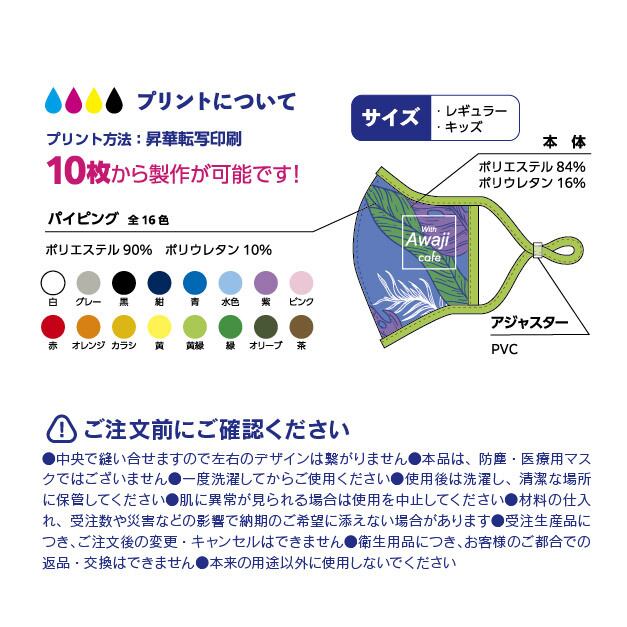 ●中央で縫い合せますので左右のデザインは繋がりません●本品は、防塵・医療用マスクではございません●一度洗濯してからご使用ください●使用後は洗濯し、清潔な場所に保管してください●肌に異常が見られる場合は使用を中止してください●材料の仕入れ、受注数や災害などの影響で納期のご希望に添えない場合があります●受注生産品につき、ご注文後の変更・キャンセルはできません●衛生用品につき、お客様のご都合での返品・交換はできません●本来の用途以外に使用しないでください